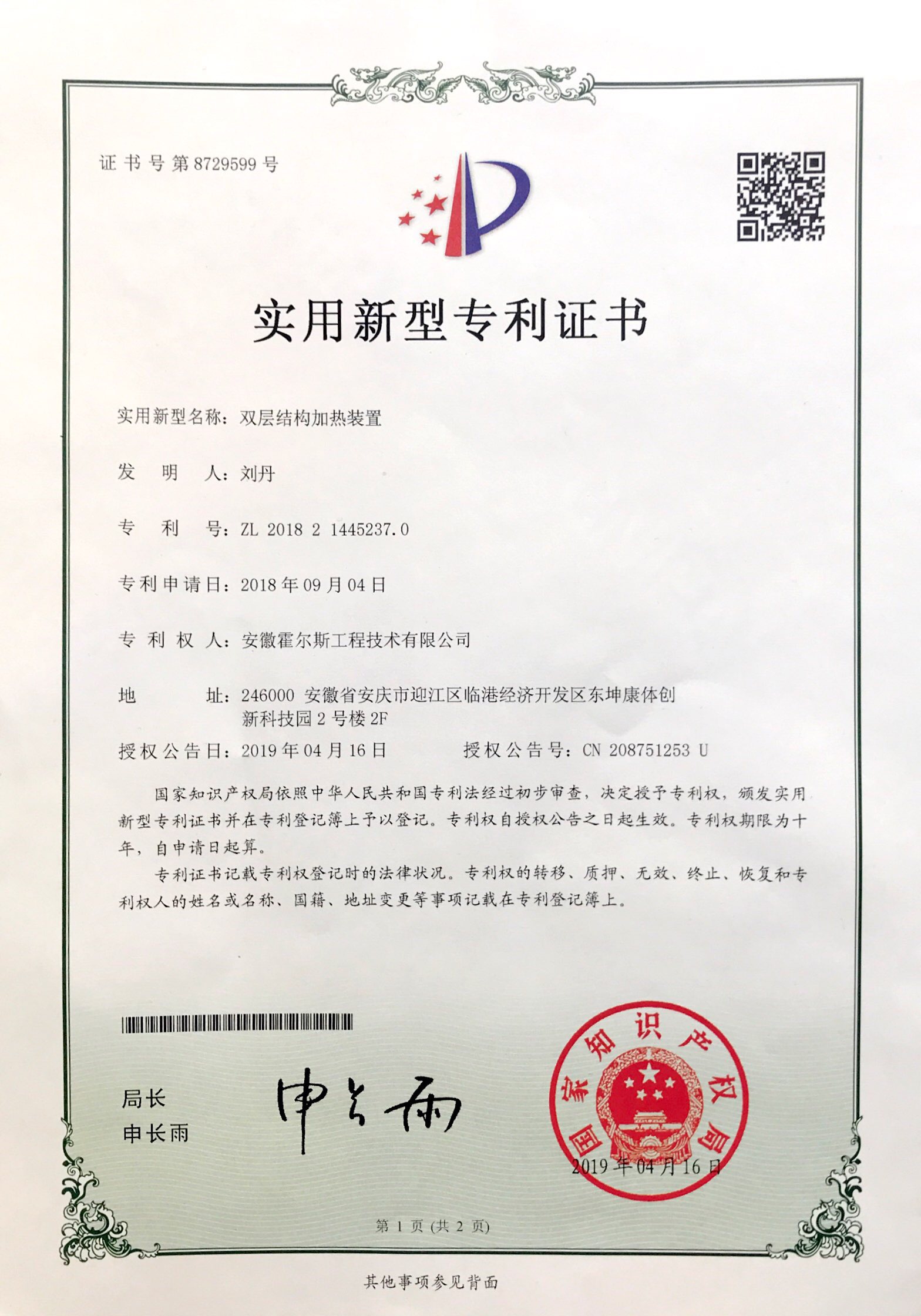 双层结构加热设计增加了空气在加热器中通过的时间,使得发热管热量更好传递给空气,保证了对空气温度的要求,发热管在发热过程中,热能有效的被加热外管和加热內管吸收,在空气通过时,提高了热接触面积,提高了热转化效率,同时有提高了能效利用率。近期,该项设计已成功获得国家专利证书,这是撸撸在线视频公司坚持自主研发的又一新的成果。